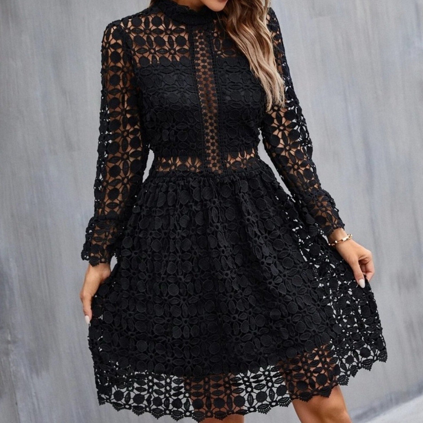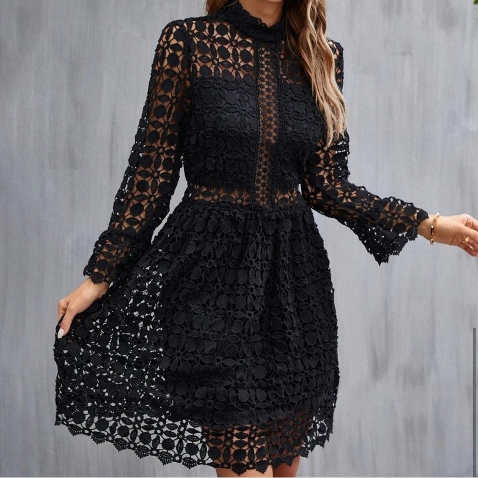 black Mock Neck Flounce Sleeve Lace Dress